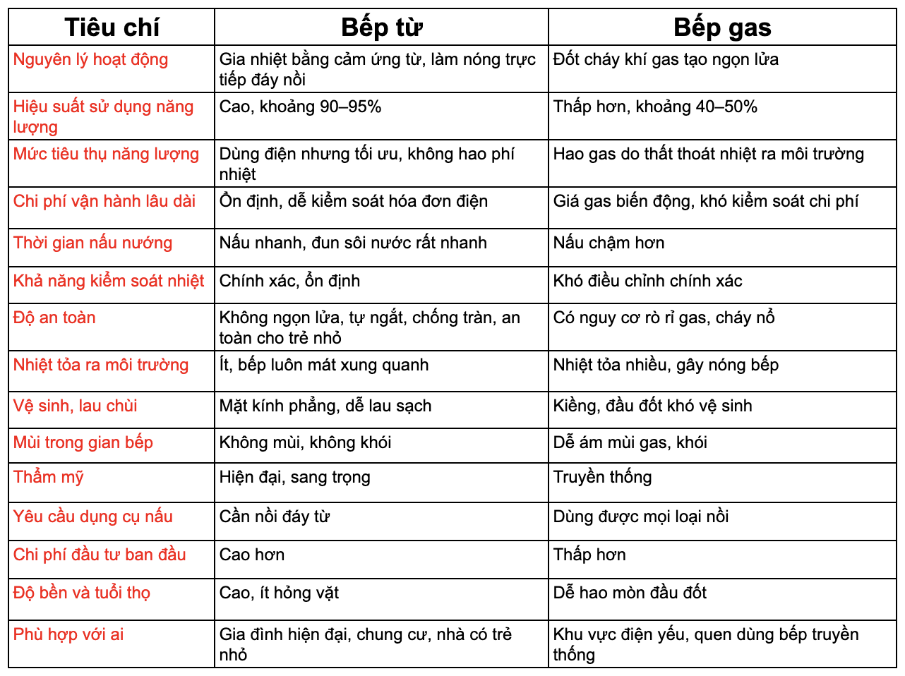 Bảng so sánh chi tiết sản phẩm bếp từ và bếp gas