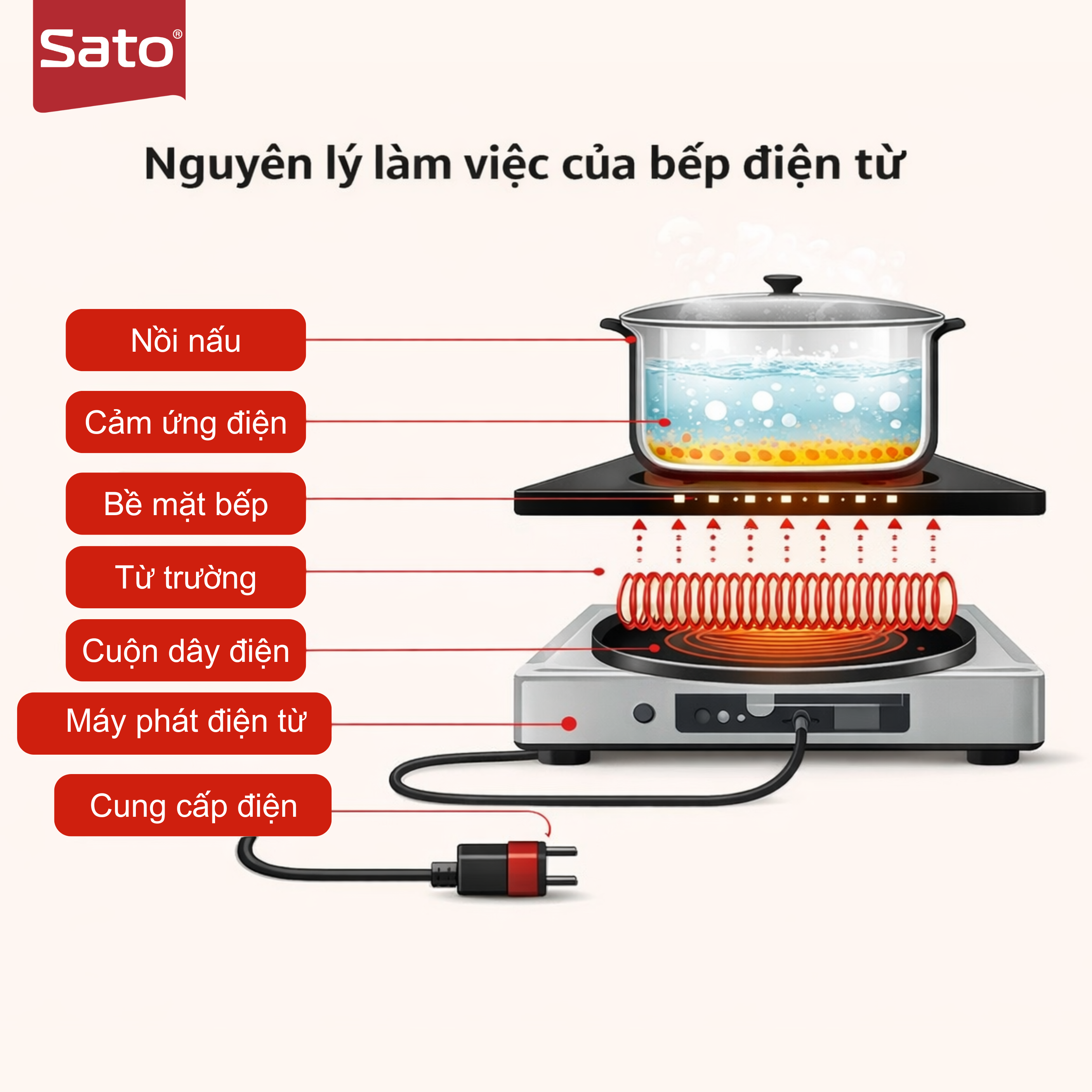 Bếp từ hoạt động dựa trên nguyên lý cảm ứng điện từ (dòng điện Foucault), sử dụng dòng điện biến thiên chạy qua cuộn dây đồng đặt dưới mặt kính để sinh ra từ trường. Từ trường này tạo ra các dòng điện xoáy (Foucault) trực tiếp ở đáy nồi có từ tính, làm nóng nồi nhanh chóng mà không cần làm nóng mặt bếp trước, đạt hiệu suất nhiệt cao.