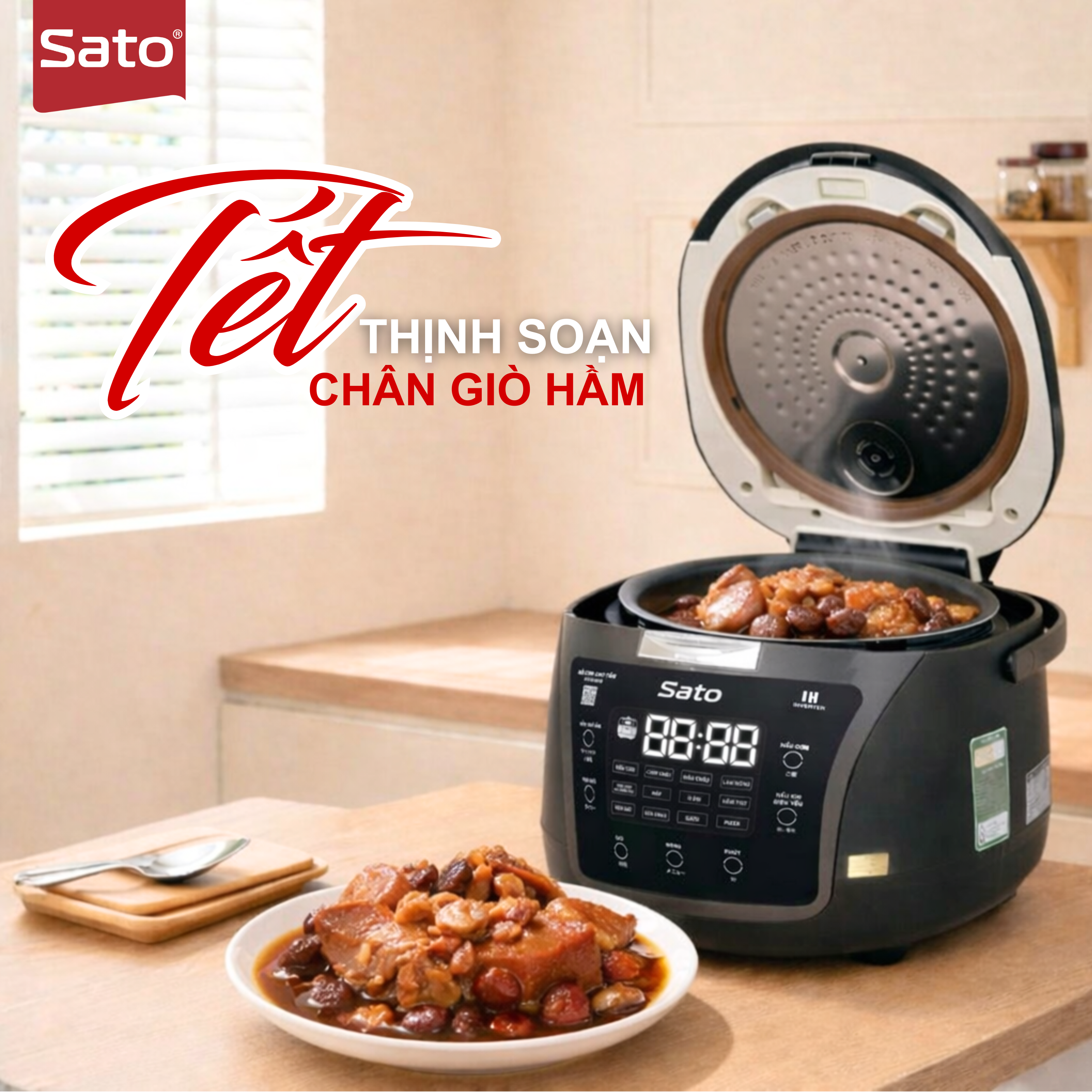 Với nồi cơm điện cao tần Sato, món hầm được nấu theo cơ chế gia nhiệt đa chiều, giúp nhiệt lan tỏa đều khắp lòng nồi. Nhờ đó, chân giò nhanh mềm, phần thịt không nát, nước dùng trong và thơm mùi thuốc bắc.